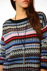 This multi color sweater will excite everybody you encounter! Passersby are guaranteed to take a delighted double take at the geo prints and snuggly silhouette of this feline-friendly striped pullover, causing the streets to buzz with tails of your adorable look!