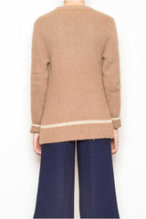 Indi and Cold long sleeve wool blend cardigan in soft camel colour. Beautiful knitted cardigan with long sleeves, V neck and button front. 2 side pockets with embroidery details. Fantastic worn with a great pair of ankle boots. Designed in Spain.