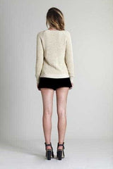 The Rebellion Knit is an acrylic fabric, plaited through with sparkles and accented in crisscrossed tape detailing.