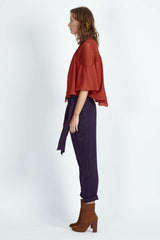 Tangled Up Top by Three of Something featuring easy fit bell sleeve and cotton lace inserts. Beautiful rust colour that goes with nearly everything. Designed in Australia.