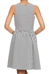 You will look set to be a future baking champion when you ' re bedecked in this darling striped dress. Glazed with black and white stripes organized in both horizontal and vertical orientations - and flaunting a notched neckline above a gathered skirt - this fit and flare frock is as sweet as they come!