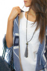 This adorable tribal print cardigan is here for you when no other piece will do! You look brilliantly boho as you strut with your sweetheart while draped in this kimono-style jacket! Lana wool & Alpaca blend fabric is decorated with soft slate blue and white tribal prints, while fabulously fringed sleeves sway with your sashay. Made in Italy.