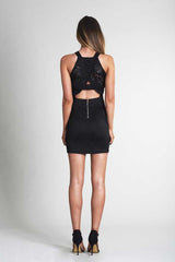 Merciful Fate Dress by Three of Something. Features a lazer cut motif at the bust contrasted with scuba plain black at the skirt. Open back cross over panels with elasticised band for an easy fit. Exposed zip entry at the back skirt. Fully lined. Super comfortable and flattering.