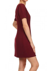 This scuba tee dress comes in this season's most popular color - red wine. It features low back and darts, above the knee length and short sleeves. It is perfect for work or evening occasions.