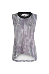 ISLA CHRYSLER WRAP TOP from The Maze Collection. Perfectly soft grey and white graphic vest, with a contrasting ribbed yolk and draping wrap dipped back.