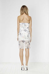 This beautiful strapless pleated midi party dress in exclusive Elle print features white base stripe with abstract print semi sheer overlay. Perfect outfit for wedding or garden parties.