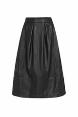 ISLA DAPHNE SKIRT from The Maze Collection. This black faux-leather midi-skirt will flatter any figure, with a banded high waist this voluminous pleated A-line design is cut just below the knee and will look smoking with a simple top and heels. Concealed zip and button closure.