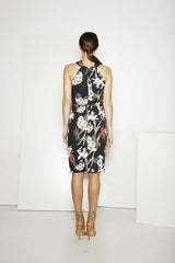 ISLA WASTED WORDS MIDI DRESS from the Luna Collection. For the dark romantics. This knee-length bodycon dress in a bold floral palette tied back with dark navy, has a beautiful gathered halter-neck line. Fully lined with a rear vent for ease of movement. Concealed rear zip and hook closure. Hand wash cold water. Designed in Australia.