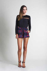 Exclusive Three of Something Fortuens print on CDC base. These shorts are a classic tailored fit with fixed waist band and invisable zip closure. Front panel is bonded for a heavier drape, and back panel is stretch scuba fabric.