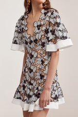 Keepsake the Label makes a case for bold lacework with the Break Free Lace Mini Dress. Rendered in a striking black and white floral palette, the fit-and-flare silhouette is beautifully complemented with white trimmings and a ruffled hemline. Designed in Australia.