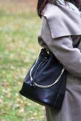 這款時尚水桶包採用真皮製成。在紐約用愛製造。