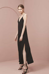 Keepsake 品牌的 Two Minds 長洋裝採用輕盈布料製成,採用吊帶款式。這件連身裙的簡潔線條體現了紀念品的極簡主義哲學。採用 V 領口和細可調節肩帶,交叉在裸露的背部,並帶有金色環細節。側邊開衩,背面隱形拉鍊。襯裡至大腿上部。搭配夏日平底鞋,打造別緻的白天造型。澳洲設計。