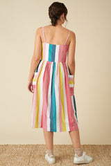 輕鬆舒適,這是您完美的夏季吊帶連身裙。真正的套穿單品,配有全褶裙和貼袋,只需添加您最喜歡的涼鞋即可出發。充滿活力的彩虹條紋讓人想起夏日陽光下碼頭上的冰淇淋。