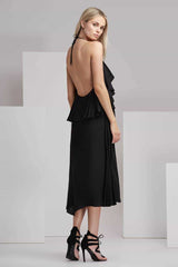 Finders Keepers 出品的 Mateo 洋裝是露背派對洋裝。採用高掛脖式領口,背面繫帶細節,採用輕盈布料,飄逸合身。飾有層疊褶邊,勾勒出領口至腰部的輪廓。設計適合全身放鬆穿著,尺寸準確。搭配個性耳環。澳洲設計。
