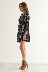 May the Label 出品的 Time After Time 迷你連身裙正面、背面中央和袖口採用十字交叉鑲片,正面紐扣貫穿,深墨底上飾有獨特的蕨類植物和花卉印花。過渡到秋冬的完美單品。澳洲設計。