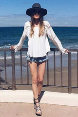 STEVIE MAY 專注於 First Bright 系列中的 WIND 頂部。這款透氣的白色棉質罩衫上衣採用梯形領口、喇叭形長袖設計,腰部完美剪裁,充滿女性魅力和浪漫氣息。這款流暢的設計採用纖細的絲綢歐根紗鑲片精製而成,體現出迷人的波西米亞精神。 部落客最愛 - 如上所示 時尚部落格 Inspiring Wit 的 Janelle Witty 雷切爾·埃德森