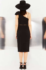 Opium 系列的 TALULAH RTW VIVIAN 裹身洋裝。這款單肩款式洋裝旨在打造修長、瘦長的廓形,緊密貼合您的身體輪廓,不對稱的圍裹效果裙身採用迷人的中長下擺剪裁。這款小黑裙時尚得無可挑剔,肩部飾有褶皺垂墜細節,腰部有帶狀梯形飾邊,露出一絲肌膚。全襯裡,配有隱藏式側拉鍊和鉤扣。澳洲設計。