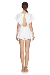 Sierra 系列的 TALULAH RESORT AVENUE 喇叭袖連身褲。這款漂亮的白色馬德拉刺繡連身褲配有飄逸飄逸袖子和蕾絲飾邊,背面飾有個性剪裁。這款修身設計穿過緊身胸衣,收緊腰部,並柔和地喇叭形形成寬腿迷你短褲。部分襯裡,帶有內嵌側袋。頸部有一顆紐扣,後部隱藏式拉鍊和鉤扣。澳洲設計。