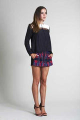 柔軟斜紋布長袖上衣,背面有鑰匙孔扣環閉合。胸部上方採用透明歐根紗面板,正面中央採用黑色鑲邊細節。軛處還具有紋理喬其紗面板。