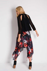 手帕下擺中長裙,採用半透明喬其紗底布製成,全身數位印花。全襯裡。模特兒所穿尺寸為 S。