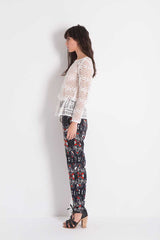 蕾絲上衣,腰部有拉繩,低背領口採用幾何蕾絲條紋設計。