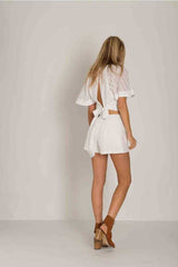 上衣採用誇張袖子和背面繫帶細節,並採用 Three of Something 獨特的英式刺繡設計。澳洲設計。